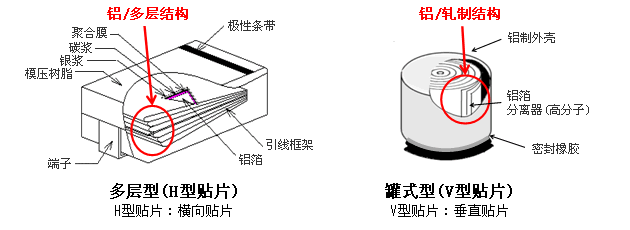 2. “罐式”型(V型貼片):這種類型的電容器采用了軋制鋁材結(jié)構(gòu)作為陽極,同樣使用固體導(dǎo)電高分子作為陰極。與H型貼片相比,V型貼片的結(jié)構(gòu)更為簡單,通常具有較大的容量和較高的電壓承受能力。然而,由于其體積較大,不太適合用于對空間要求較高的場合。